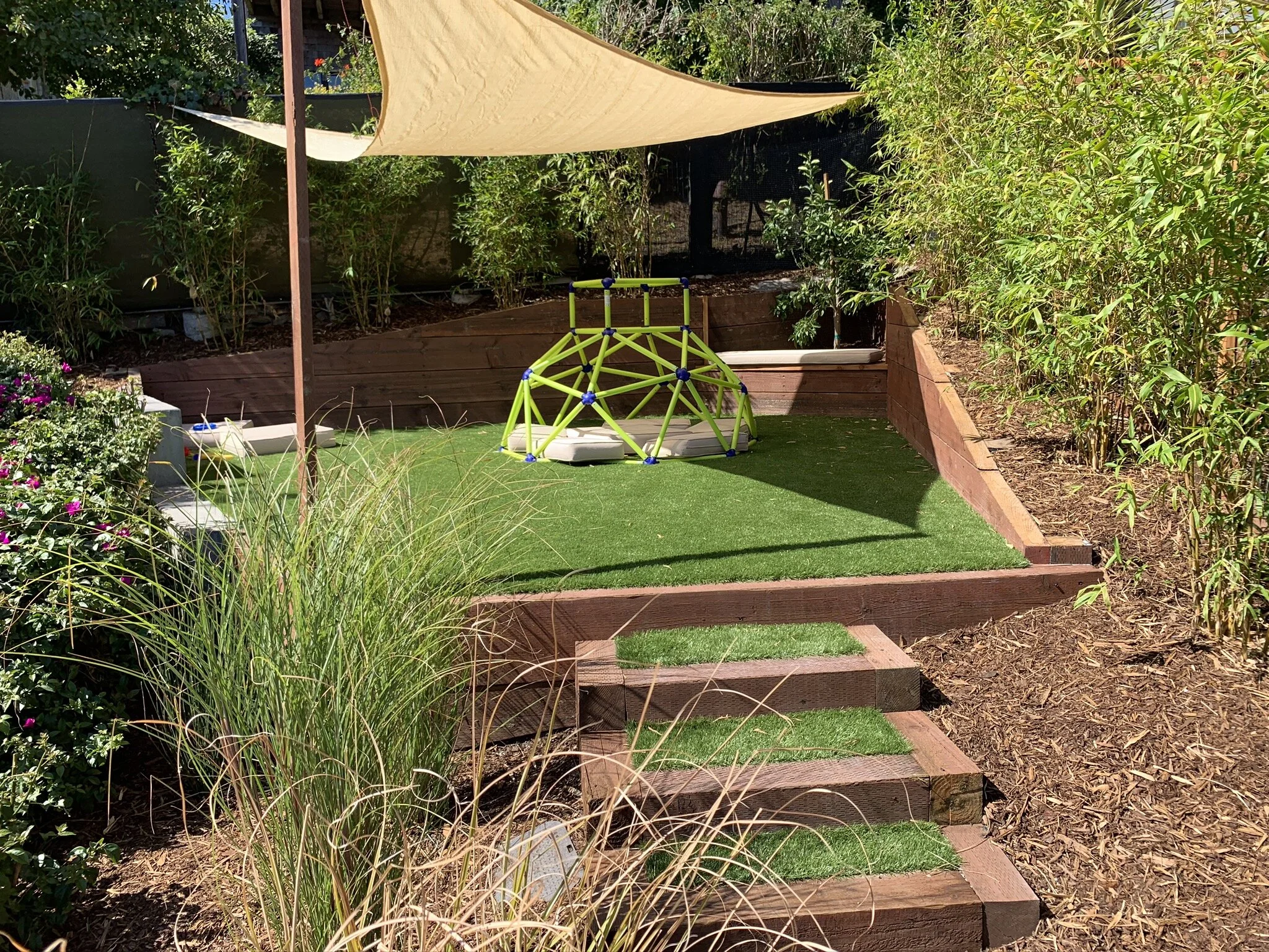 For the play area, it was essential to balance aesthetics and functionality. The designated space is framed by low-maintenance shrubs and flowering perennials, creating a natural boundary that remains visually cohesive with the surrounding landscape. Inside this area, a durable ground cover of engineered grass ensures safety while also being soft and inviting for play. A small climbing structure, combined with nearby seating for supervision, creates a whimsical yet practical environment. This cohesive approach not only enhances the overall attractiveness of the property but also ensures a safe and enjoyable space for the client’s daughter to play.
